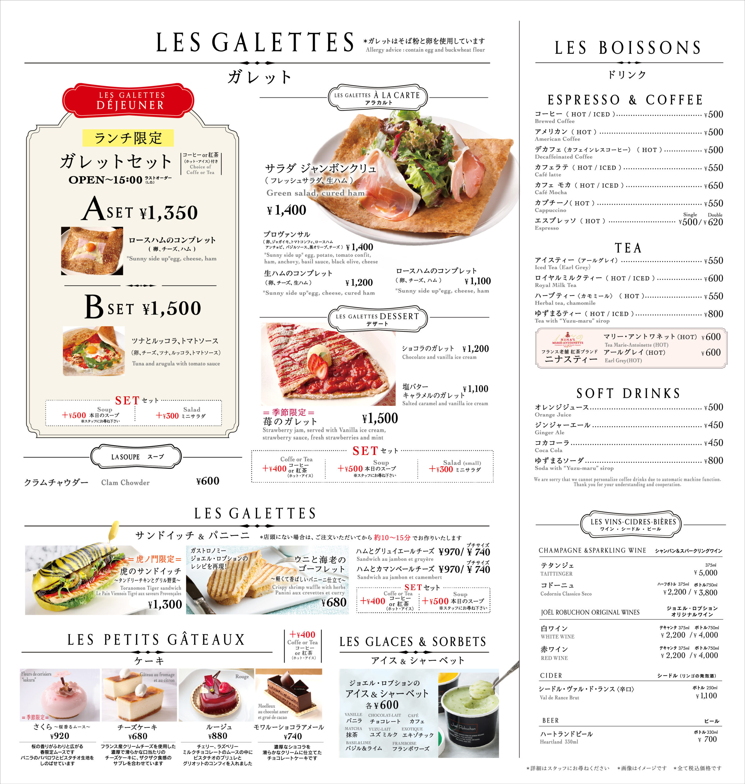 ジョエル・ロブションの料理哲学はそのままに、カフェならではのガレットやサンドイッチをイートイン、テイクアウトで気軽にお愉しみいただけます。また、焼き菓子をはじめとするギフトも種類も豊富にご用意。シーンに合った商品をお選びいただけます。