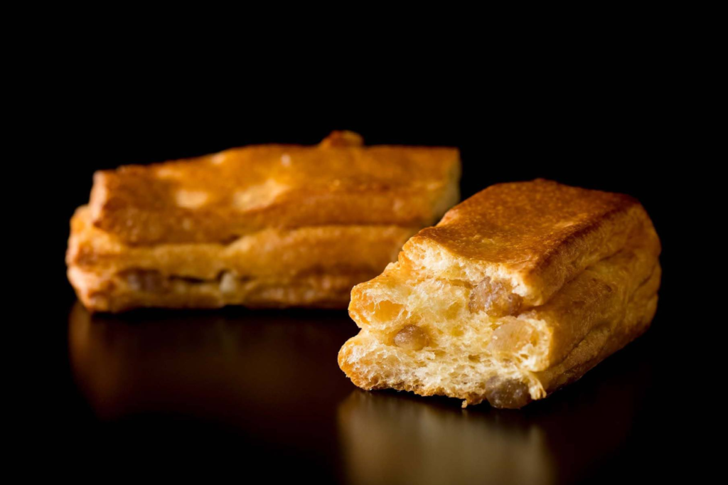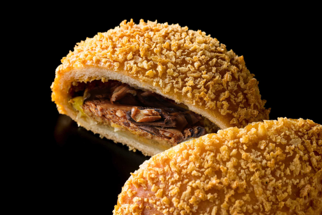 旬の味覚が楽しめる季節の限定商品として、主役となるマッシュルーム、しめじ、舞茸といった3種のきのこに、はちみつを加えたまろやかなカレーソースを合わせました。それぞれを別々にパン生地に包むことで、きのこの旨味とカレーソースのスパイシーさが引き立ちます。生地はほんのり甘くて柔らかく、自家製パン粉をまぶしスペイン産オリーブオイルをかけて、さっくりと仕上げた焼きカレーパンです。