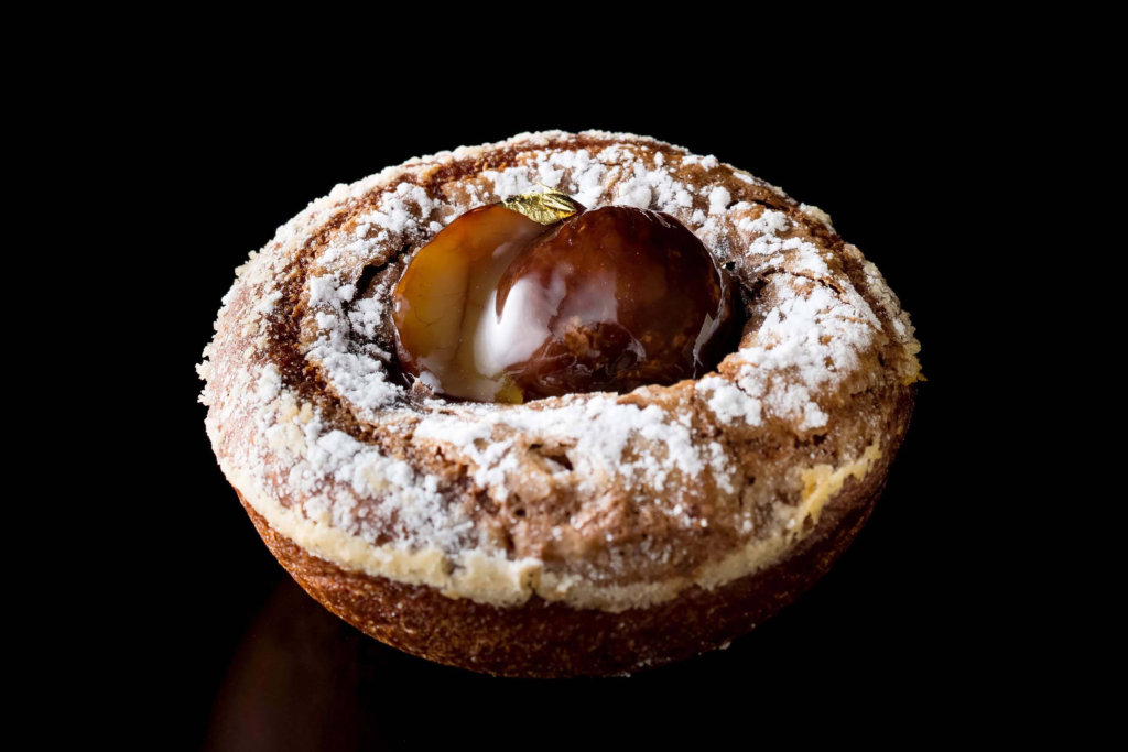 ラムが香る濃厚で甘みのあるたっぷりのマロンクリームを、ほろ苦いチョコレートのブリオッシュで包みました。上には渋皮煮の栗があしらわれ、甘さとほろ苦さが調和した一品です。