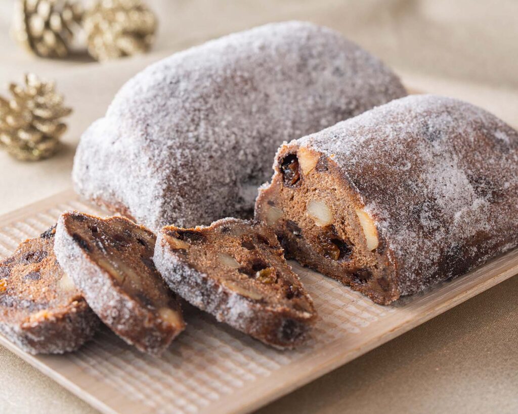 チョコレートのシュトーレンです。ソーテルヌワイン(デザートワイン)に漬けたレーズンやビターチョコレートを、アールグレイ、カルダモンで香り付けした生地に練り込み、香り高く仕上げました。ブランデーにもよく合う大人のシュトーレンです。