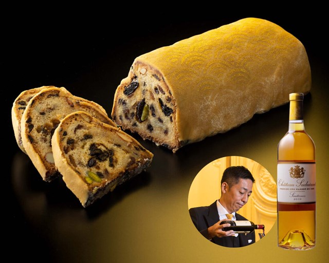 フランス・ボルドー地方、ソーテルヌ村で一流シャトーとして君臨しているシャトー スデュイロー。輝きのある黄金色をした外観、香りはアプリコットや黄桃、マンゴー、マンダリンオレンジ、優美でリッチな香りが感じられ、味わいは滑らかな口当たりで凝縮感のある甘さの中に心地よい酸味も感じられます。最高峰の貴腐ワインを贅沢に使用しており、コンポートしたシャインマスカットの風味を更に引き立てており、今年も味わい豊かなジョエル・ロブションならではのシュトーレンに仕上がっています。