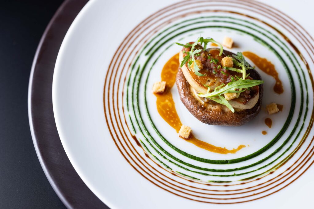 フォアグラのプランシャ焼きを岩手県産しいたけ”禅丸”のフリットに乗せて