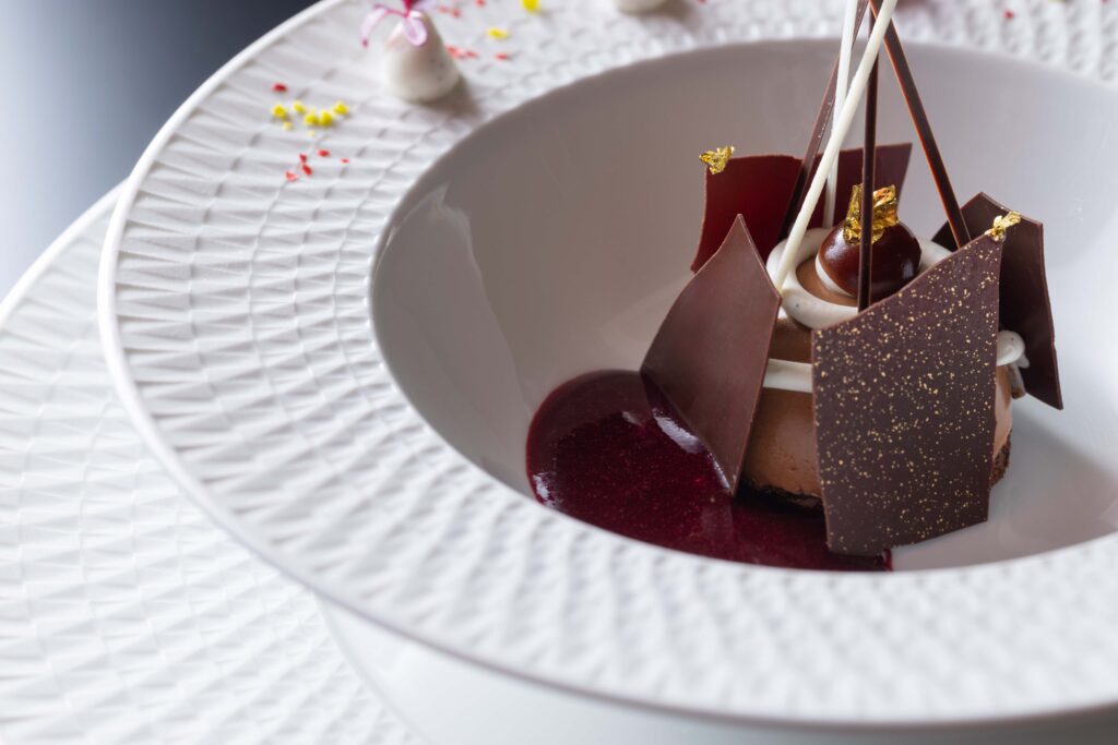締めくくりには、パリ ラトリエ ドゥ ジョエル・ロブション〈エトワール〉のシェフパティシエ、ルノー・バコネ氏とともに試作を重ね完成させたグランデセールを。国産ウィスキーに漬け込んだグリオットチェリーを軽やかなチョコレートムースで包み込んだ、斬新かつスタイリッシュなフォレノワールです。