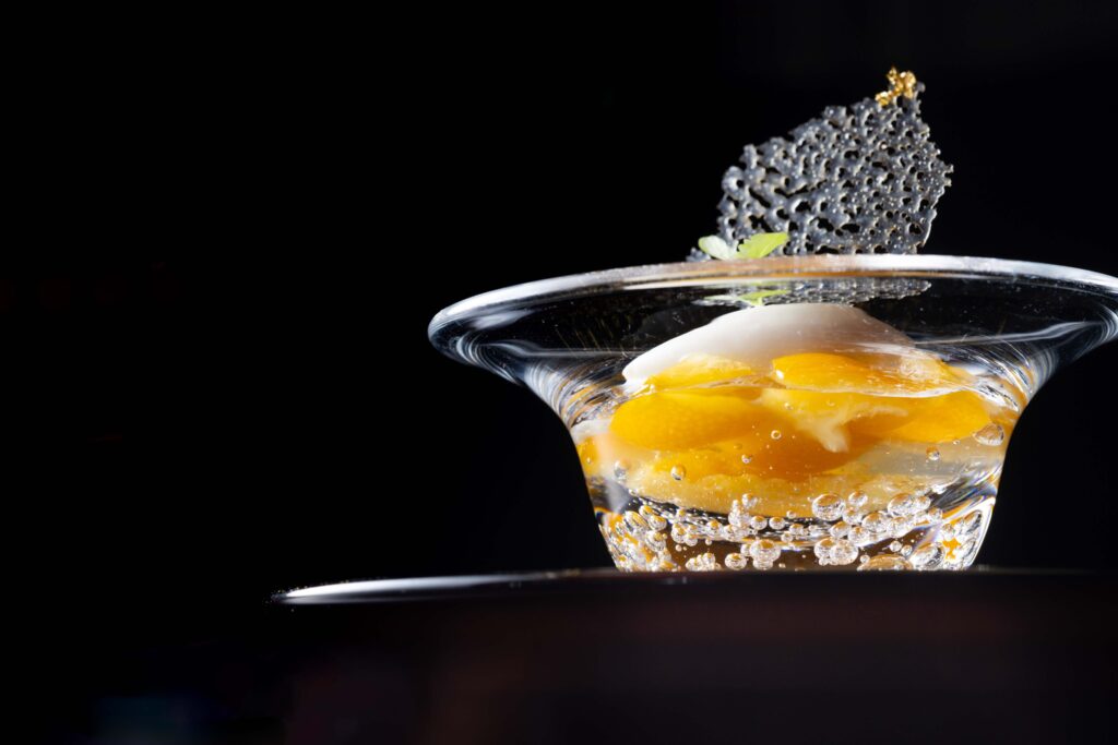 続く 温前菜では、フォアグラのプランシャ焼きと、丸ごとフリットにした岩手県産しいたけ<禅丸ZENMARU>の2つの食材が主役になります。ひとくち頬張るごとにあふれる、ジューシーな味わいの<禅丸>の旨味とフォアグラの脂が重なり合い、互いの魅力を引き立てる組み合わせに仕上がりました。