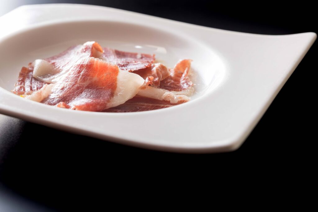 アミューズブッシュは、ロブション氏が自ら選び抜いたスペイン・ホセリート社の36ヶ月熟成イベリコ生ハムから始まります。