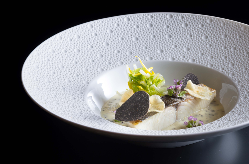 お魚料理は三重県答志島の一本釣り“トロさわら”を。極上のトロさわらと香り高い黒トリュフを、トピナンブールのヴルーテ、そして愛知県イチローファームのクリアな味わいのミニ白菜のサラダと合わせてお召し上がりください。