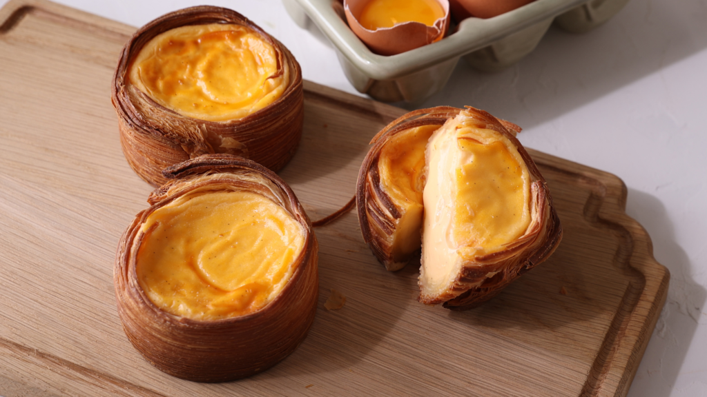 発酵バターを織り込んだ生地に、濃厚なコクと甘みが特徴の「御養卵」、コク深いクレーム・ドゥーブルを合わせ、さらにバニラビーンズを贅沢に使用したクリームを流し込み、丁寧に焼き上げました。職人が一つひとつ丹念に作り上げる、こだわりの『フランヴァニーユ』を、ぜひご堪能ください。